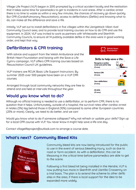 In 2024, VLP partnered with Whitecastle and Skenfrith Community Councils to ensure the maintenance of 14 publicly available defibrillators in the area.VLP is introducing Community Bleed Kits for public use in cases of serious bleeding injuries, with a trial in Hendre, Skenfrith, and Llantilio Crossenny, aiming for wider expansion with local support. CPR and defibrillator training significantly improves survival rates after cardiac arrest, especially given lower survival rates in Wales compared to other European countries.