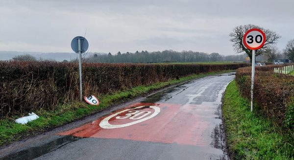 The 30mph sign has been knocked off and damaged.