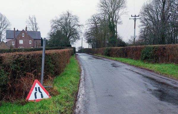 The Road Narrows sign has fallen off the pole.