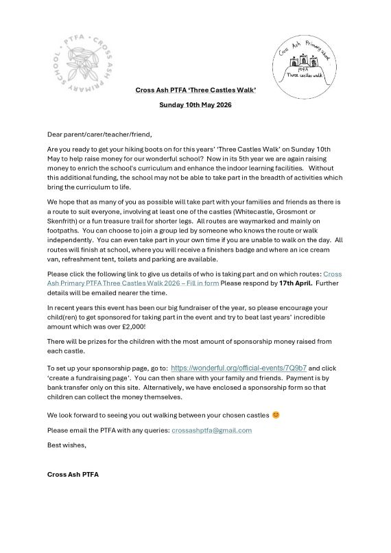 Cross Ash PTFA ‘Three Castles Walk’ Sunday 10th May 2026